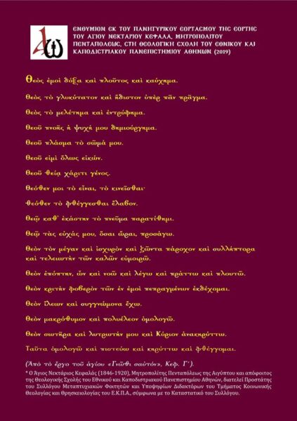 Πραγματοποιήθηκε την Πέμπτη 7 Νοεμβρίου 2019 ο πανηγυρικός εορτασμός της μνήμης του Αγίου Νεκταρίου Κεφαλά (1846-1920), Μητροπολίτου Πενταπόλεως της Αιγύπτου και αποφοίτου της Θεολογικής Σχολής του Εθνικού και Καποδιστριακού Πανεπιστημίου Αθηνών, στο Ιερό Παρεκκλήσιο της Θεολογικής Σχολής, χοροστατούντος του Σεβασμιωτάτου Μητροπολίτου Μεσσηνίας κ. Χρυσόστομου (Σαββάτου), Καθηγητή, και με την ένθερμη συμμετοχή Αρχών, Καθηγητών, Προσωπικού και φοιτητών/τριών της Σχολής.