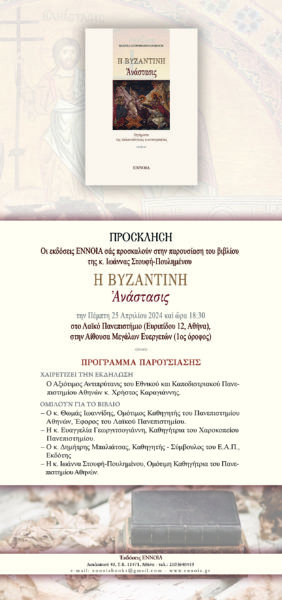 Παρουσία του βιβλίου “Η Βυζαντινή Ανάστασις”, της Ομότιμης Καθηγήτριας της Θεολογικής Σχολής Αθηνών Ιωάννας Στουφή – Πουλημένου, θα πραγματοποιηθεί την Πέμπτη, 25 Απριλίου 2024, στις 18:30, στο Λαϊκό Πανεπιστήμιο (Ευριπίδου 12) στην Αίθουσα Μεγάλων Ευεργετών (1ος όροφος).