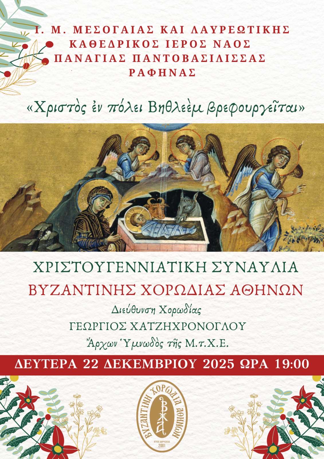 Η Pemptousia TV θα καλύψει την χριστουγεννιάτικη συναυλία της βυζαντινής χορωδίας Αθηνών η οποία θα πραγματοποιηθεί τη Δευτέρα 22 Δεκεμβρίου στις 19:00, στον ιερό ναό Παντοβασίλισσας Ραφήνας.