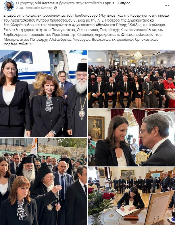 Στη Λευκωσία μετέβη το Σάββατο 12 Νοεμβρίου 2022 η Υπουργός Παιδείας και Θρησκευματών Νίκη Κεραμέως, όπου παρέστη στην Εξόδιο Ακολουθία του μακαριστού Αρχιεπισκόπου Κύπρου κυρού Χρυσοστόμου Β’ στον Ιερό Καθεδρικό Ναό του Αποστόλου Βαρνάβα εκπροσωπώντας τον Πρωθυπουργό Κυριάκο Μητσοτάκη και την Κυβέρνηση.