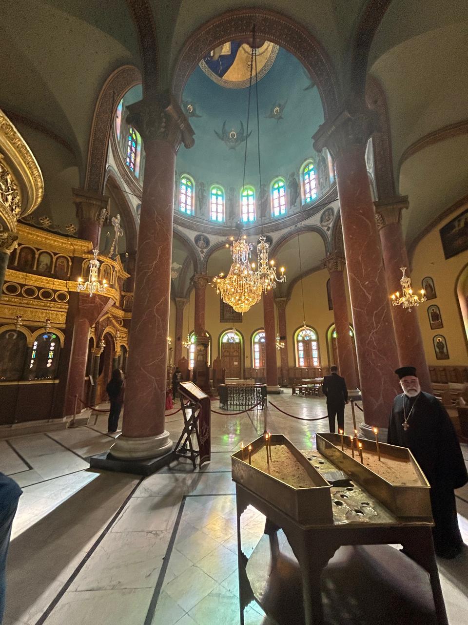 Η Λίνα Μενδώνη με τον Μητροπολίτη Σάββα στην Ιερά Μονή Αγίου Γεωργίου, στο Κάιρο