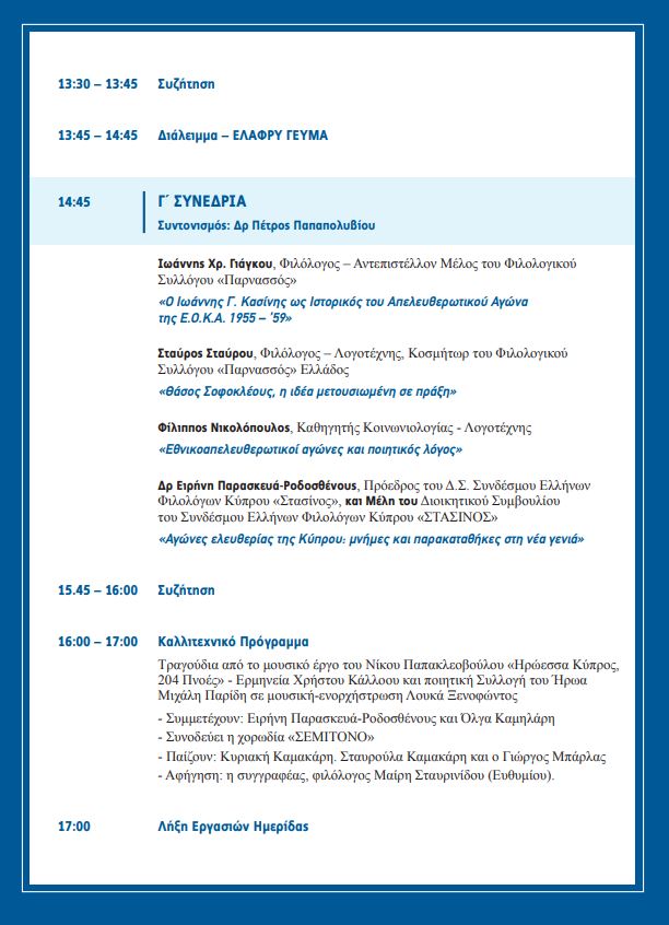 Ημερίδα με θέμα «Αγώνες ελευθερίας του Κυπριακού Ελληνισμού. Ιστορική διαδρομή, μνήμες, νόστος και λογοτεχνική παραγωγή», θα διεξαχθεί στις 26 Ιανουαρίου 2024 στην Αθήνα, στο Μέγαρο του Φιλολογικού Συλλόγου «Παρνασσός».