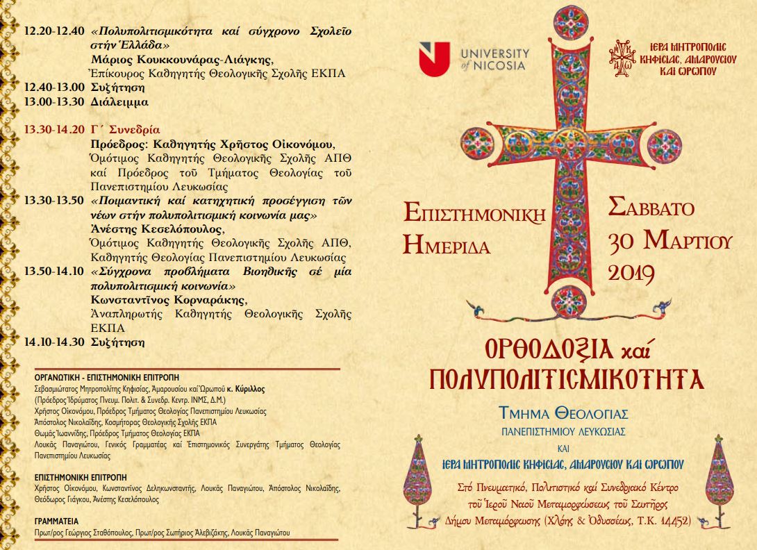 Ημερίδα, με θέμα: “Ορθοδοξία και Πολυπολιτισμικότητα” συνδιοργανώνουν το Τμήμα Θεολογίας του Πανεπιστημίου Λευκωσίας και η Ιερά Μητρόπολη Κηφισίας το Σάββατο 30 Μαρτίου και ώρα 10:00 π.μ. στο Πνευματικό, Πολιτιστικό Συνεδριακό Κέντρο του Ιερού Ναού Μεταμορφώσεως του Σωτήρος Δήμου Μεταμόρφωσης. Η ημερίδα πραγματοποιείται στα πλαίσια συνεργασίας των δύο φορέων για τη δημιουργία “Κέντρου Μάθησης” στην Αττική, με σκοπό την λειτουργία προγράμματος μεταπτυχιακών και διδακτορικών σπουδών.