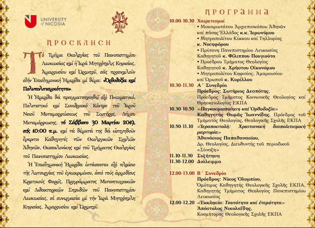 Ημερίδα, με θέμα: “Ορθοδοξία και Πολυπολιτισμικότητα” συνδιοργανώνουν το Τμήμα Θεολογίας του Πανεπιστημίου Λευκωσίας και η Ιερά Μητρόπολη Κηφισίας το Σάββατο 30 Μαρτίου και ώρα 10:00 π.μ. στο Πνευματικό, Πολιτιστικό Συνεδριακό Κέντρο του Ιερού Ναού Μεταμορφώσεως του Σωτήρος Δήμου Μεταμόρφωσης. Η ημερίδα πραγματοποιείται στα πλαίσια συνεργασίας των δύο φορέων για τη δημιουργία “Κέντρου Μάθησης” στην Αττική, με σκοπό την λειτουργία προγράμματος μεταπτυχιακών και διδακτορικών σπουδών.