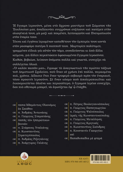 Tέκνα και εγγόνια ιερωμένων καταθέτουν την εμπειρία τους κοντά στον ρασοφόρο πατέρα η παππού τους. Μαρτυρίες πολύτιμες, γραμμένες ειδικά για αυτόν τον τόμο, συνοδεύονται κι από άλλα κείμενα, για άλλες περιπτώσεις αφοσιωμένης έγγαμης ιεροσύνης. Καθώς, βεβαίως, λείπουν ονόματα πολλά και γνωστά, συνεχίζει να συλλέγεται υλικό.