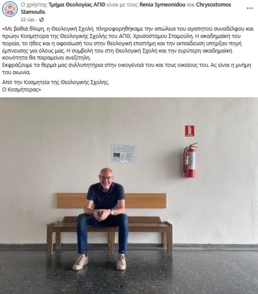 Συγκλονισμένοι και με βαθύ πόνο από το αιφνίδιο και απροσδόκητο του θλιβερού αγγέλματος της κοίμησης του ακριβού μας συναδέλφου, ευχόμαστε στη σύζυγό του, στα παιδιά του και στους οικείους του, ο Κύριος να απαλύνει την ψυχή τους με παρηγοριά και να τάξει την ευγενή ψυχή του εις τόπον αναπαύσεως», τονίζεται στο μήνυμα του Τμήματος Θεολογίας του ΑΠΘ για τον αιφνίδιο θάνατο του Χρυσόστομου Σταμούλη.