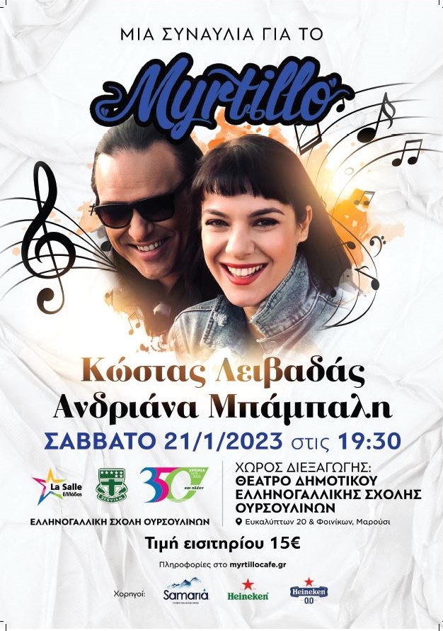 Η Κοινωνική Συνεταιριστική Επιχείρηση MYRTILLO θα εορτάσει τα 9 χρόνια λειτουργίας του, με δύο εξαίρετους καλλιτέχνες , τον συνθέτη Κώστα Λειβαδά που έχει χαρίσει μοναδικά τραγούδια και την υπέροχη φωνή της Ανδριάνας Μπάμπαλη, το Σάββατο 21 Ιανουαρίου στις 19:30, στο θέατρο – Ελληνογαλλική Σχολή Ουσρουλινών – Νηπιαγωγείο Δημοτικό σχολείο, στο Μαρούσι. Χορηγός επικοινωνίας είναι το Ινστιτούτο Άγιος Μάξιμος ο Γραικός.