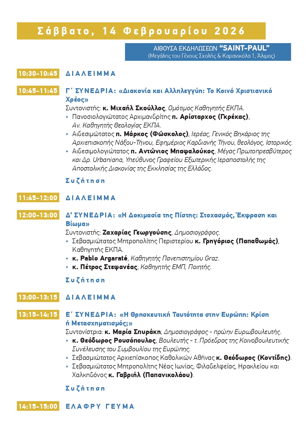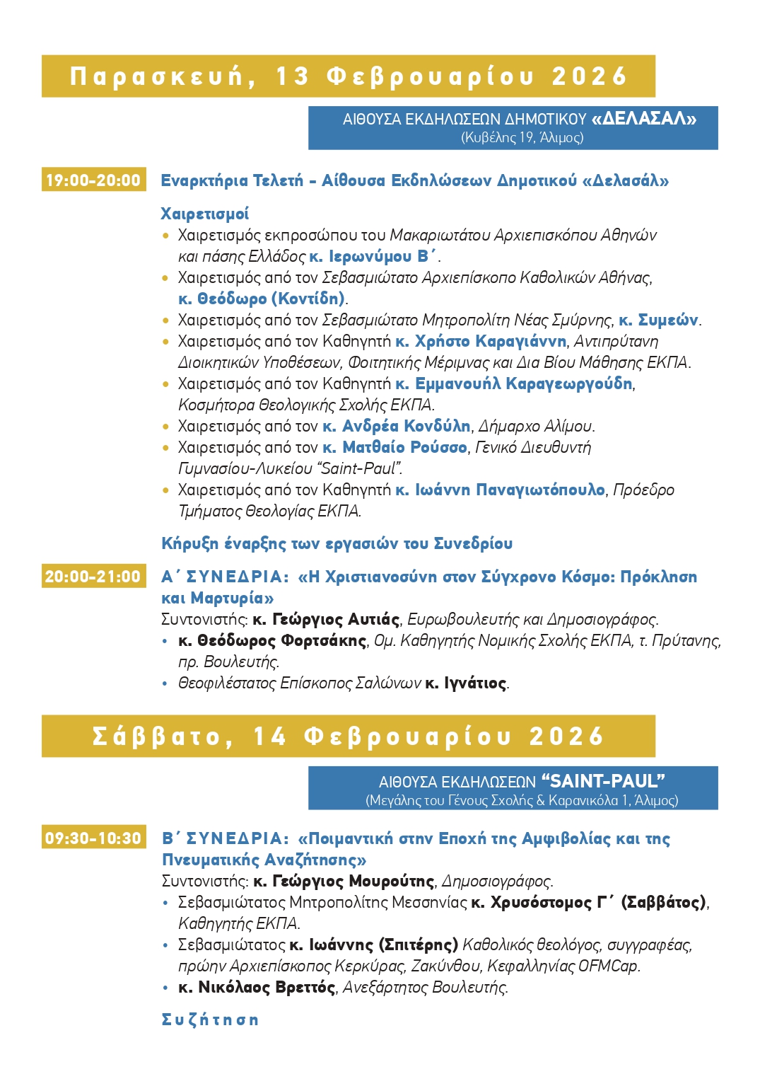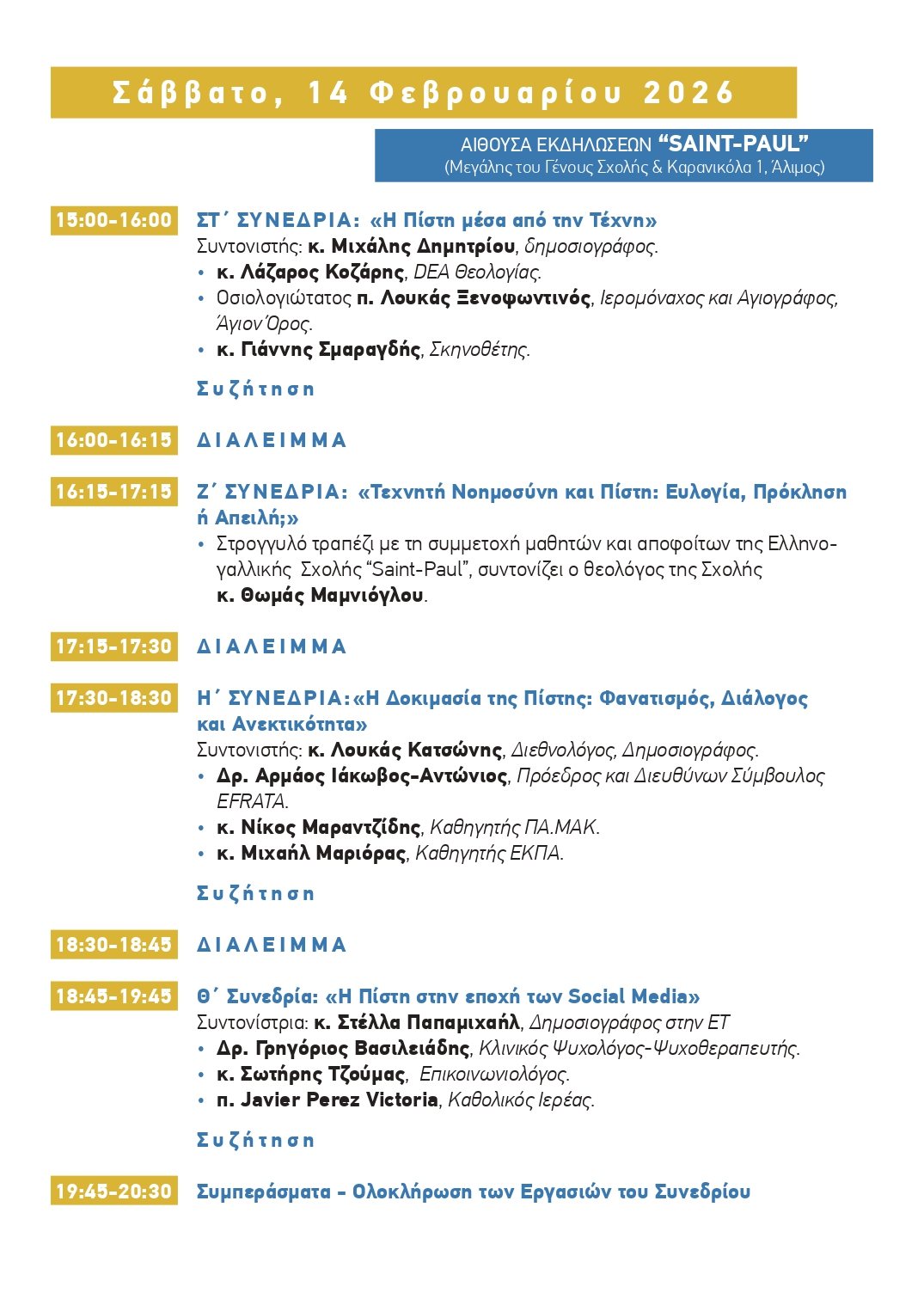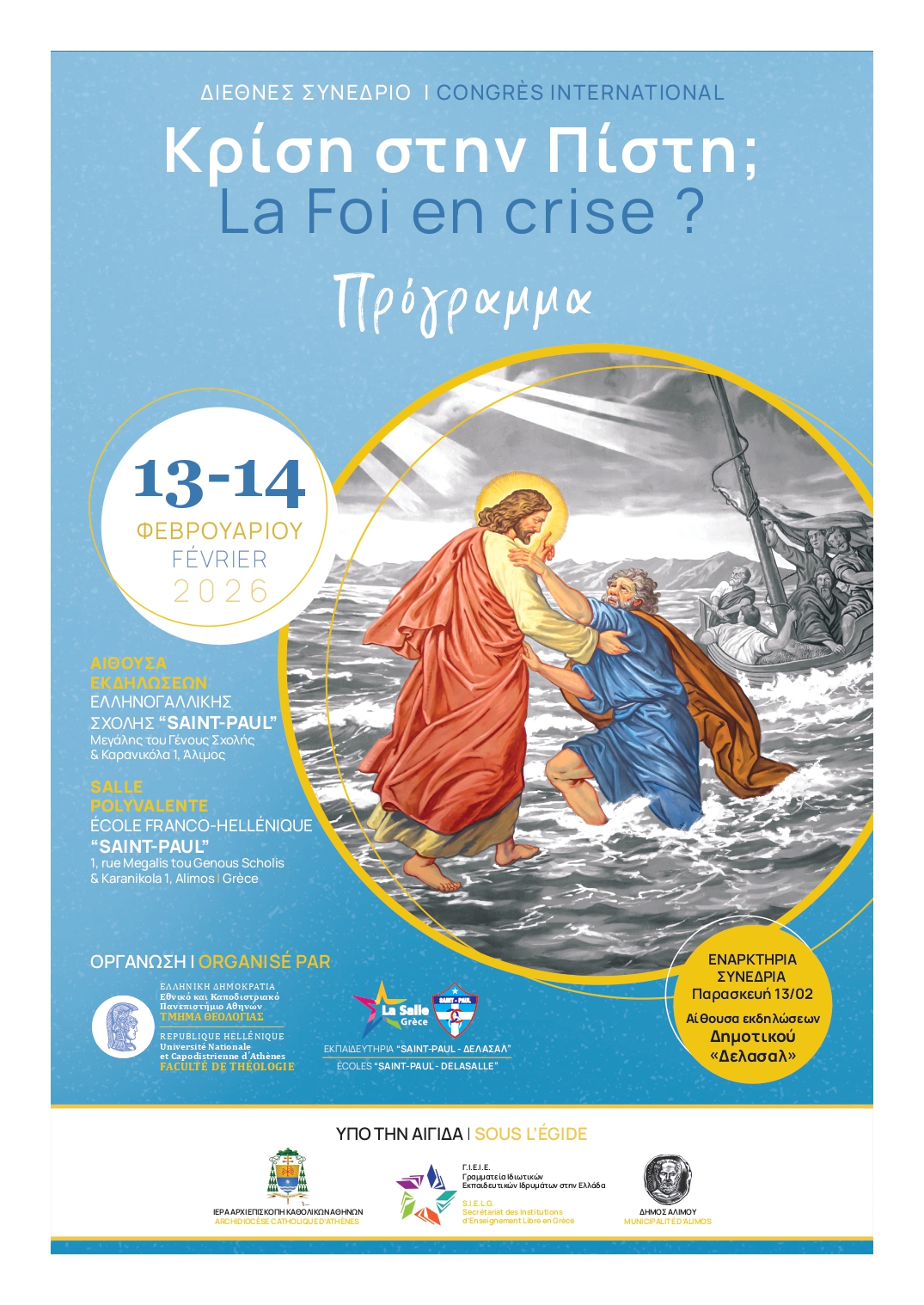 Το Τμήμα Θεολογίας της Θεολογικής Σχολής του Εθνικού και Καποδιστριακού Πανεπιστημίου Αθηνών (Ε.Κ.Π.Α.) και τα Ελληνογαλλικά Εκπαιδευτήρια “Saint-Paul – Δελασάλ” Αλίμου προσκαλούν στο Διεθνές Συνέδριο με θέμα: «Κρίση στην Πίστη;», το οποίο θα πραγματοποιηθεί την Παρασκευή 13 και το Σάββατο 14 Φεβρουαρίου 2026.