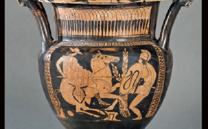 Το αρχαίο δοχείο (38,5 x 38,5 εκατ.!) είναι ερυθρόμορφο.Στο κέντρο υπάρχει μια περίεργη, όσο και σκηνή: Ένας ιππέας αγωνίζεται με γυμνό πεζό πολεμιστή, ο οποίος με το ένα πόδι του, το δεξί, απωθεί τον ίππο! Το άλογο μοιάζει πραγματικά να διστάζει… Βαστά ασπίδα με παράσταση φιδιού. Φορά περικεφαλαία. Ο ιππέας πλούσιος / αριστοκράτης, φορά μανδύα, πλατύγυρο καπέλο, και μπότες. Βαστά ακόντιο…Θα μπορούσε να είναι μια σκηνή από τον Πελοποννησιακό Πόλεμο (431-404 π.Χ.). Στο χείλος είναι διακοσμημένο με αγριόχοιρους και λιοντάρια, με μαύρο χρώμα.Στο πίσω μέρος υπάρχουν τρεις θηλυκές φιγούρες. (Η εικόνα τους δεν δόθηκε στην δημοσιότητα, κι όμως θα μπορούσαμε να εξάγουμε κάποια συμπεράσματα και απ’ αυτήν)…