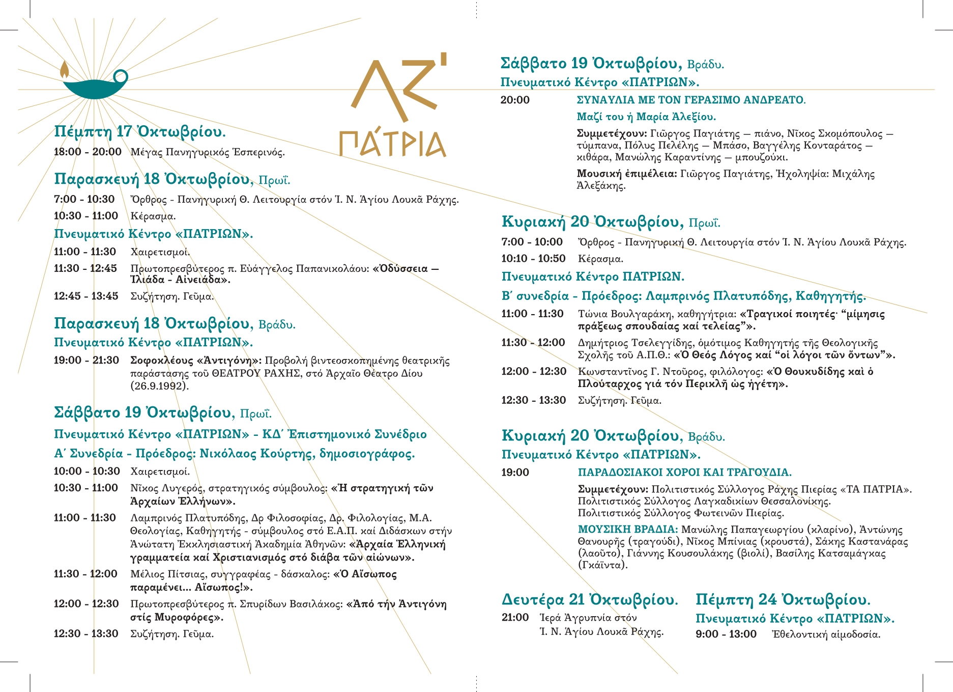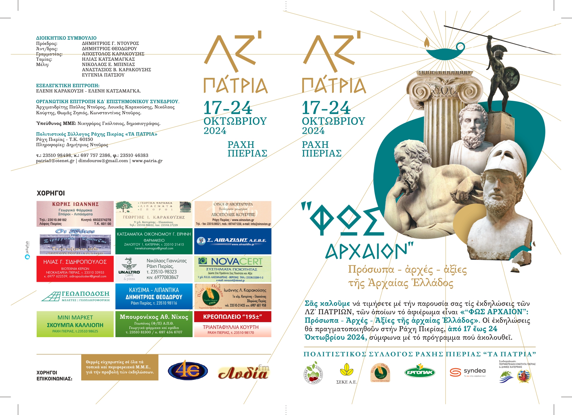 Ο πολιτιστικός Σύλλογος Πιερίας καλεί στις εκδηλώσεις των ΛΖ’ Πατρίων, των οποίων το αφιέρωμα λέγεται: “Φως Αρχαίον. Πρόσωπα – αρχές – αξίες της Αρχαίας Ελλάδος”. Οι εκδηλώσεις θα λάβουν χώρα στη Ράχη Πιερίας από τις 17 έως 24 Οκτωβρίου.