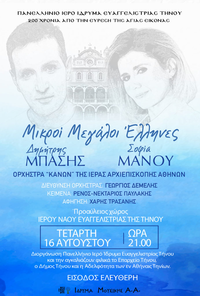Το Πανελλήνιο Ιερό Ίδρυμα Ευαγγελιστρίας Τήνου με αφορμή τα 200 χρόνια από την εύρεση της Αγίας εικόνας, παρουσιάζει την μουσική εκδήλωση με τον τίτλο: «Μικροί Μεγάλοι Έλληνες», την Τετάρτη 16 Αυγούστου 2023 στον προαύλειο χώρο του Ιερού Ναού Ευαγγελιστρίας Τήνου στις 21:00 μ.μ.