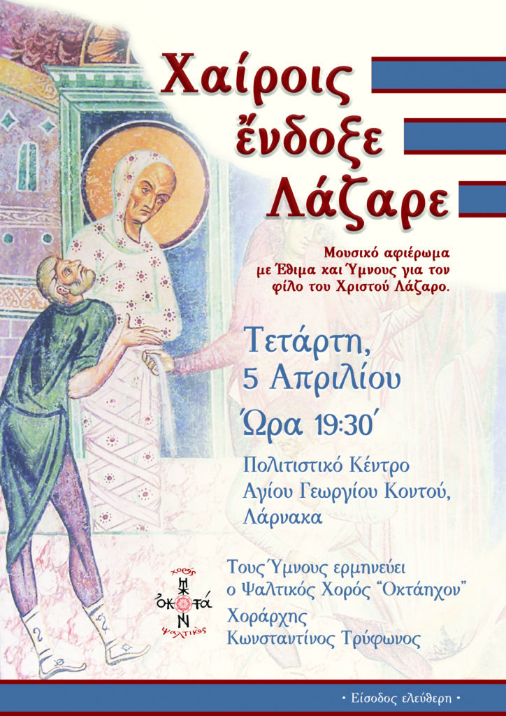 Ο Ψαλτικός Χορός ΟΚΤΑΗΧΟΝ διοργανώνει εκδήλωση με τίτλο «Χαίροις ένδοξε Λάζαρε», ένα μουσικό αφιέρωμα με Έθιμα και Ύμνους στον φίλο του Χριστού Λάζαρο, την Τετάρτη 5 Απριλίου 2023 στις 19:30, στην αίθουσα εκδηλώσεων του Πολιτιστικού Κέντρου του Αγίου Γεωργίου Κοντού στη Λάρνακα.