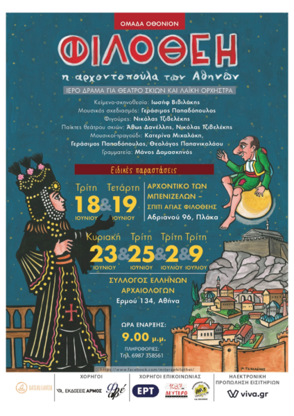 “Φιλοθέη η αρχοντοπούλα των Αθηνών”, ένα πρωτότυπο δράμα με θέμα τη ριψοκίνδυνη δράση της Αγίας Φιλοθέης, που πρόσφερε την περιουσία της σε έργα αλληλεγγύης στην οθωμανική Αθήνα του 16ου αιώνα.