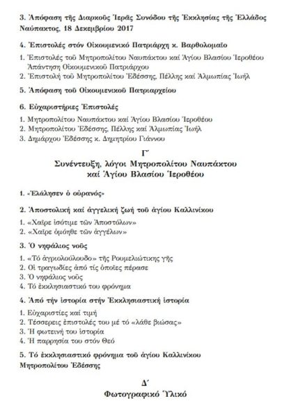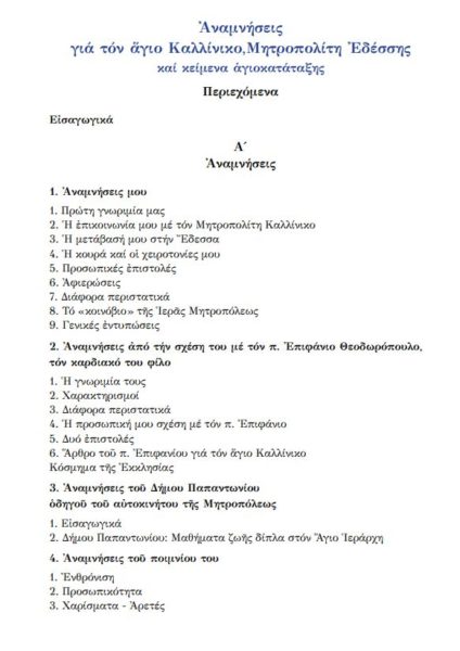 “Ἀναμνήσεις ἀπό τόν ἅγιο Καλλίνικο, Μητροπολίτη Ἐδέσσης καί κείμενα ἁγιοκατάταξης” είναι ο νέος τίτλος του βιβλίου του Μητροπολίτη Ναυπάκτου και Αγίου Βλασίου κ. Ιεροθέου για τον Άγιο Καλλίνικο όπου δημοσιεύονται αναμνήσεις κληρικών, μοναχών και λαϊκών που γνώρισαν τον Άγιο Καλλίνικο, Μητροπολίτη Εδέσσης, Πέλλης και Αλμωπίας.