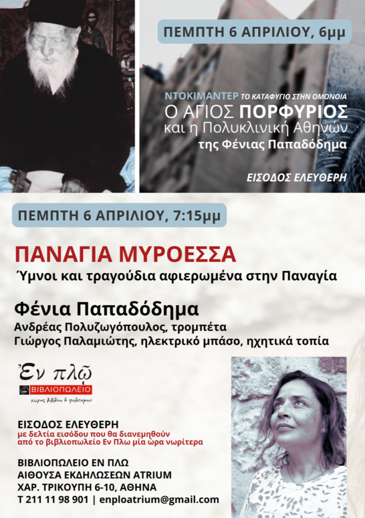 Το βιβλιοπωλείο Εν Πλω, σ’ ένα ξεχωριστό αφιέρωμα, λίγες μέρες πριν από την Μεγάλη Εβδομάδα προσκαλούν τη Φένια Παπαδόδημα να παρουσιάσει ένα μοναδικό ηχητικό και μουσικό ταξίδι πάνω σε γνωστούς βυζαντινούς ύμνους και δικά της τραγούδια, αμέσως μετά την προβολή του ντοκιμαντέρ «Ο Άγιος Πορφύριος και η Πολυκλινική Αθηνών», του οποίου υπογράφει τη σκηνοθεσία.