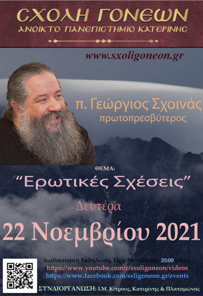 Ο πρωτοπρεσβύτερος π. Γεώργιος Σχοινάς, Εφημέριος του Αγίου Νικολάου Φιλοπάππου, έγγαμος και πατήρ 5 τέκνων είναι ο ομιλητής της Σχολής Γονέων – Ανοικτό Πανεπιστήμιο Κατερίνης την Δευτέρα 22 Νοεμβρίου 2021, στις 20:00.