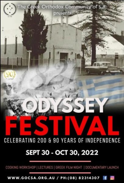 Η Ελληνική Ορθόδοξη Κοινότητα Νότιας Αυστραλίας διοργανώνει και φέτος το Ελληνικό Πολιτιστικό Φεστιβάλ Αδελαΐδας «Οδύσσεια», συμπληρώνοντας 15 χρόνια πολιτιστικής προσφοράς στην Νότια Αυστραλία. Από τις 30 Σεπτεμβρίου έως τις 30 Οκτωβρίου, η Αδελαΐδα θα ζήσει σε ρυθμούς ελληνικούς.