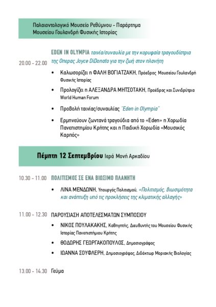 Οι εργασίες του Συμποσίου θα πλαισιωθούν από εκπαιδευτικές δράσεις για μαθητές, του Μουσείο Φυσικής Ιστορίας Κρήτης και του Μουσείο Γουλανδρή Φυσικής Ιστορίας, καθώς και με την προβολή ταινίας με την συναυλία της παγκοσμίου φήμης τραγουδίστριας της όπερας Τζόυς ΝτιΝτονάτο, που έχει διακριθεί για την οικολογική της ευαισθητοποίηση.
