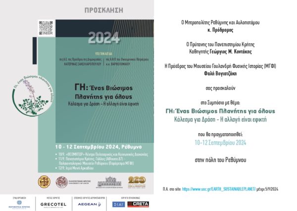 Το φλέγον ζήτημα της κλιματικής αλλαγής, η βιωσιμότητα και η αειφορία, θα τεθούν στο επίκεντρο του τριήμερου Οικολογικού Συμποσίου «ΓΗ: Ένας Βιώσιμος Πλανήτης για όλους – Κάλεσμα για Δράση – Η αλλαγή είναι εφικτή», που θα πραγματοποιηθεί στο Ρέθυμνο μεταξύ 10 και 12 Σεπτεμβρίου 2024.