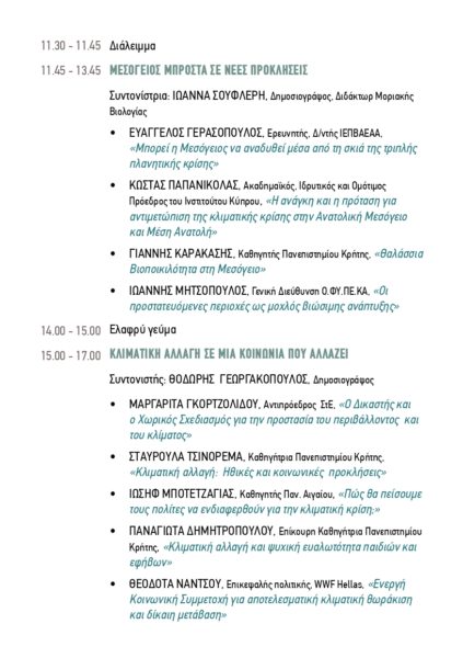 Περιλαμβάνει ομιλίες αξιόλογων προσωπικοτήτων από όλη τη χώρα, οι οποίοι πέραν των διαπιστώσεων, θα προτείνουν δράσεις, προκειμένου η κοινωνία των πολιτών να αφυπνιστεί και να ευαισθητοποιηθεί σχετικά με την κλιματική κρίση και να αναλάβει δράση.