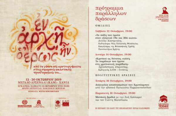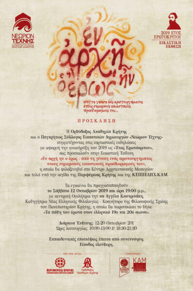 Η Ορθόδοξος Ακαδημία Κρήτης με αφορμή την ανακήρυξη του 2019 ως «Έτους Ερωτόκριτου» και συμμετέχοντας στις εορταστικές εκδηλώσεις, σε συνεργασία με τον Παγκρήτιο Σύλλογο Εικαστικών Δημιουργών «Νεώριον Τέχνης» και υπό την Αιγίδα της Περιφέρειας Κρήτης & της ΚΕΠΠΕΔΗΧ-ΚΑΜ, θα πραγματοποιήσει Εικαστική Έκθεση με τίτλο: «Εν αρχή ην ο έρως – από τη γένεση ενός αριστουργήματος στους σημερινούς εικαστικούς προσδιορισμούς του», στο Κέντρο Αρχιτεκτονικής Μεσογείου από τις 12 έως 20 Οκτωβρίου 2019.