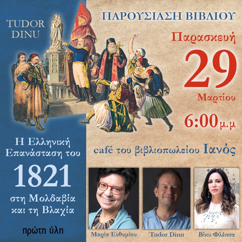 Το βιβλίο «Η Ελληνική Επανάσταση του 1821 στη Μολδαβία και τη Βλαχία» (εκδόσεις Ακρίτας) του Καθηγητή του Πανεπιστημίου Βουκουρεστίου Tudor Dinu θα παρουσιαστεί στις 29 Μαρτίου στις 18:00, στο café του βιβλιοπωλείου Ιανός. Χορηγός επικοινωνίας είναι το Ινστιτούτο Άγιος Μάξιμος ο Γραικός.