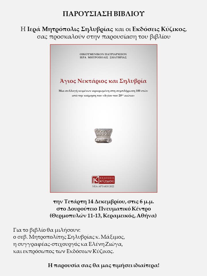 Η Ιερά Μητρόπολη Σηλυβρίας και οι Εκδόσεις Κύζικος, διοργανώνουν την παρουσίαση του βιβλίου «Άγιος Νεκτάριος και Σηλυβρία- Μια συλλογή κειμένων αφιερωμένη στη συμπλήρωση 100 ετών από την Κοίμηση του Αγίου του 20ου αιώνα», την Τετάρτη 14 Δεκεμβρίου στις 18:00, στο Δουρούτειο Πνευματικό Κέντρο.