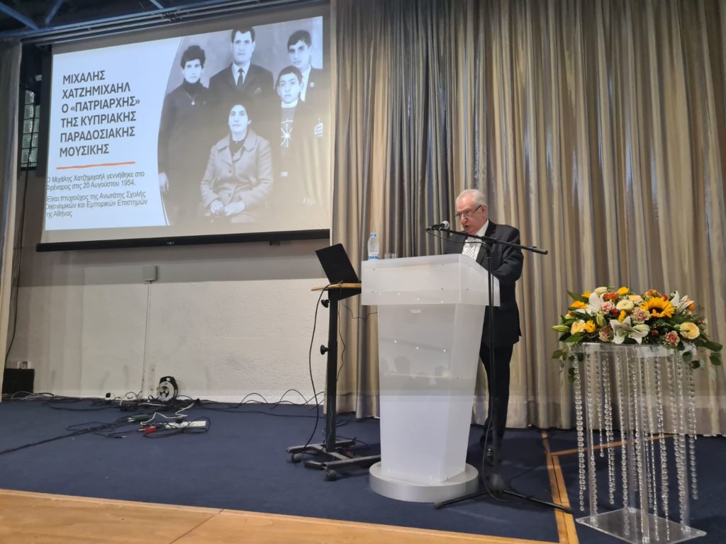 Ακολούθησε η βιογραφική παρουσίαση και προσφορά του συγγραφέα Μιχάλη Χατζημιχαήλ στο κυπριακό τραγούδι από τον κ. Γιώργο Χαλκίδη, ανώτατο αξιωματικό εν αποστρατεία, ο οποίος αναφέρθηκε στην καταγωγή του συγγραφέα από το Φρέναρος και τόνισε, πως, ενώ ήταν πτυχιούχος της Ανωτάτης Σχολής Οικονομικών και Εμπορικών Επιστημών της Αθήνας, κατέληξε μελετητής και ερευνητής της κυπριακής μουσικής παράδοσης και της λαϊκής ποίησης. Στησυνέχεια ο ομιλητής ανέφερε πως ο τιμώμενος βραβεύτηκε από την Ένωση Ελλήνων Λογοτεχνών, σε διαγωνισμό της κυπριακής ποίησης και σύνθεσης κυπριακού τραγουδιού της Αθήνας και της Επιτροπής Άυλης Πολιτιστικής Κληρονομιάς του Υπουργείου Παιδείας της Κύπρου.