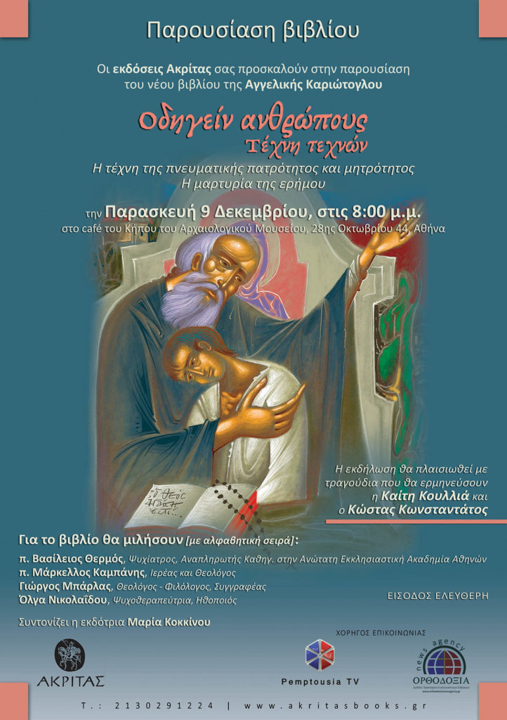 Οι εκδόσεις Ακρίτας απευθύνουν πρόσκληση στην παρουσίαση του νέου βιβλίου της Αγγελικής Τζουβάλη Καριώτογλου «Οδηγείν ανθρώπους. Τέχνη Τεχνών. Η τέχνη της πνευματικής πατρότητος και μητρότητος. Η μαρτυρία της ερήμου».