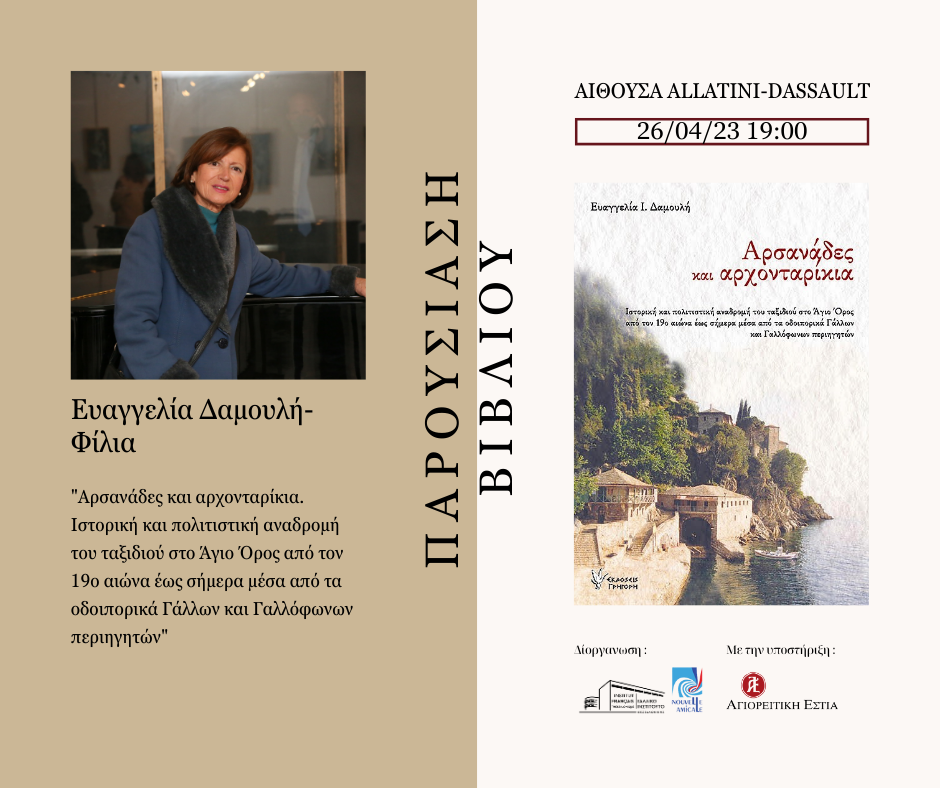 To βιβλίο της Ευαγγελίας Δαμουλή – Φίλια “Αρσανάδες και αρχονταρίκια” θα παρουσιασθεί την Τετάρτη 26 Απριλίου στις 19.00, στο Γαλλικό Ινστιτούτο στην Αίθουσα Allatini-Dassault.