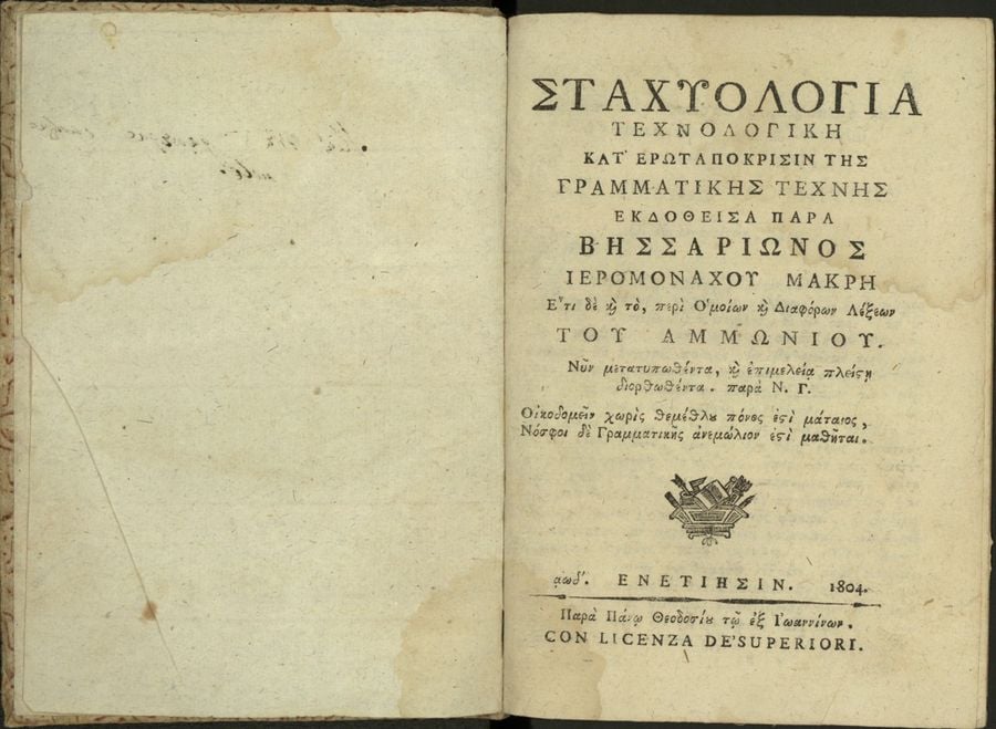 Τα λεγόμενα και «σχολεία των ιερών γραμμάτων» ακολουθούν την παράδοση των βυζαντινών χρόνων: η διδασκαλία αρχίζει με τα «πινακίδια», όπου ήταν γραμμένα τα γράμματα της αλφαβήτου, και συνεχίζει με τον συλλαβισμό και την ανάγνωση εκκλησιαστικών κειμένων. Με την είσοδο της τυπογραφίας στον ελληνόφωνο χώρο της Ανατολής και τη διακίνηση βιβλίων, τυπώνονται εγχειρίδια για την χρήση των δασκάλων και των μαθημάτων που βοηθούν στην εκμάθηση του αλφαβήτου, την ανάγνωση, τη γραφή, τη στοιχειώδη γνώση της γραμματικής. Η μέθοδος των ερωταποκρίσεων βοηθούσε στην εμπέδωση της γνώσης από τα στοιχειώδη ακόμη. (φωτο από: ΣΤΑΧΥΟΛΟΓΙΑ ΤΕΧΝΟΛΟΓΙΚΗ ΚΑΤ’ ΕΡΩΤΑΠΟΚΡΙΣΙΝ ΤΗΣ ΓΡΑΜΜΑΤΙΚΗΣ ΤΕΧΝΗΣ, ΕΚΔΟΘΕΙΣΑ ΠΑΡΑ ΒΗΣΣΑΡΙΩΝΟΣ ΙΕΡΟΜΟΝΑΧΟΥ ΜΑΚΡΗ Έτι δε και το, περί Ομοίων και Διαφόρων Λέξεων του ΑΜΜΩΝΙΟΥ. Νυν μετατυπωθέντα, και επιμελεία πλείστη διορθωθέντα. Παρά Ν. Γ., αωδ’. ΕΝΕΤΙΗΣΙΝ. 1804. Παρά Πάνω Θεοδοσίου τω εξ Ιωαννίνων. [Ιστορικό & Παλαιογραφικό Αρχείο / ΜΙΕΤ, Παλαίτυπα/Σπάνια, Συλλογή Πεζάρου, αρ. 18])