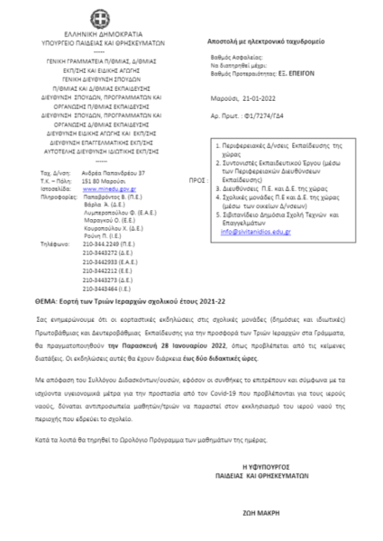 Σας ενημερώνουμε ότι οι εορταστικές εκδηλώσεις στις σχολικές μονάδες (δημόσιες και ιδιωτικές) Πρωτοβάθμιας και Δευτεροβάθμιας Εκπαίδευσης για την προσφορά των Τριών Ιεραρχών στα Γράμματα, θα πραγματοποιηθούν την Παρασκευή 28 Ιανουαρίου 2022, όπως προβλέπεται από τις κείμενες διατάξεις. Οι εκδηλώσεις αυτές θα έχουν διάρκεια έως δύο διδακτικές ώρες.