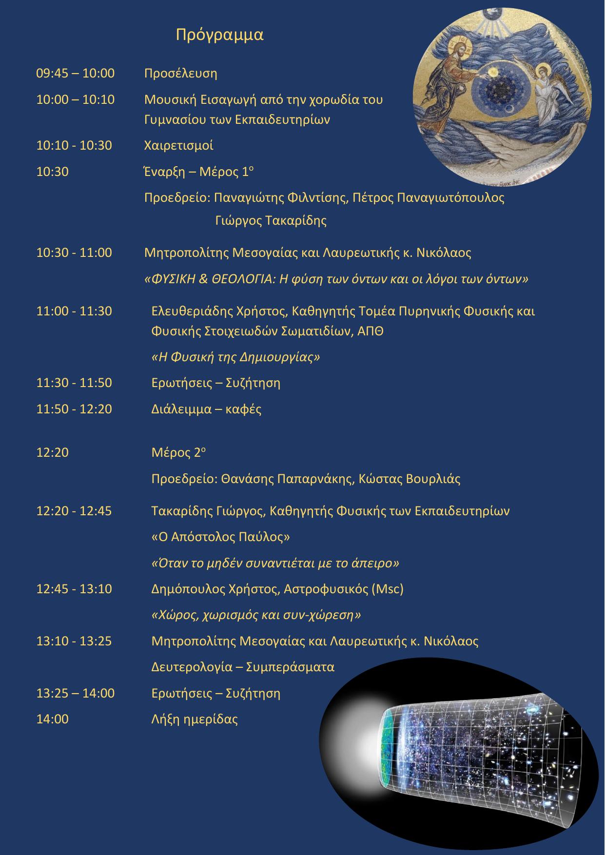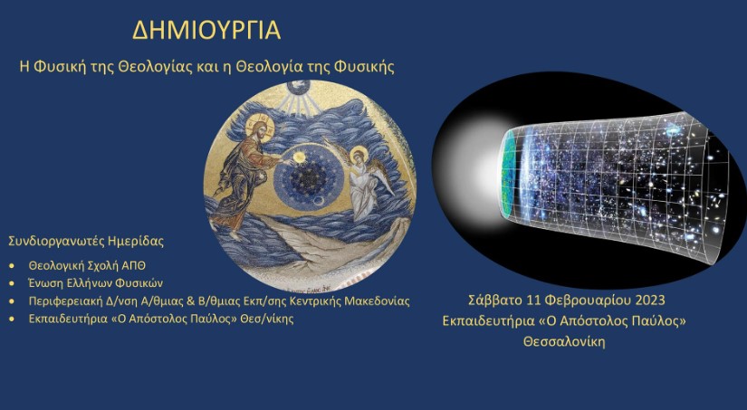 Η Θεολογική Σχολή του Αριστοτέλειου Πανεπιστημίου Θεσσαλονίκης, η Ένωση Ελλήνων Φυσικών, η Εκπαιδευτική Περιφέρεια Κεντρικής Μακεδονίας και τα Εκπαιδευτήρια «Ο Απόστολος Παύλος» Θεσσαλονίκης, προσκαλούν το Σάββατο 11 Φεβρουαρίου 2023, στις 10:00 το πρωί, στην ημερίδα: “ΔΗΜΙΟΥΡΓΙΑ: Η Φυσική της Θεολογίας και η Θεολογία της Φυσικής”.