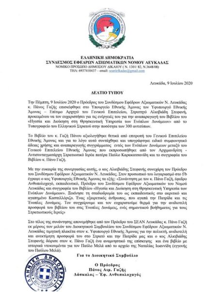 Με την ευκαιρία της συνεργασίας αυτής, ο κος Αλκιβιάδης Στεφανής συνεχάρη τον Πρόεδρο του Συνδέσμου Εφέδρων Αξιωματικών Ν. Λευκάδας. Στον προσωπικό του λογαριασμό στο f/b ο Υφυπουργός Εθνικής Άμυνας έγραψε τα εξής: «Συνάντηση με τον κ. Πάνο Γαζή, έφεδρο Ανθυπολοχαγό, εκπαιδευτικό, Πρόεδρο του Συνδέσμου Εφέδρων Αξιωματικών του Νομού Λευκάδας και συγγραφέα του βιβλίου «Ηγεσία και Διοίκηση στη Θρησκευτική Υπηρεσία των Ενόπλων Δυνάμεων». Ξεκίνησε τη σταδιοδρομία του ως εκπαιδευτικός στο ακριτικό και αγαπημένο Καστελλόριζο. Ένας εξαιρετικός άνθρωπος, που αγαπά την Πατρίδα και τις Ένοπλες Δυνάμεις. Τον συγχαίρουμε και τον ευχαριστούμε θερμά για την ανιδιοτελή προσφορά του βιβλίου του στις Ένοπλες Δυνάμεις, ενός σημαντικού βοηθήματος για τους Στρατιωτικούς Ιερείς»