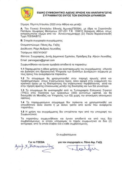 Σε 300 αντίτυπα θα κυκλοφορήσει το βιβλίο «Ηγεσία και Διοίκηση στη Θρησκευτική Υπηρεσία των Ενόπλων Δυνάμεων» του Προέδρου του Συνδέσμου Εφέδρων Αξιωματικών Ν. Λευκάδας, κ. Πάνου Γαζή, μετά την υπογραφή ειδικού συμφωνητικού άδειας χρήσης και αναπαραγωγής συγγράμματος εντός των Ενόπλων Δυνάμεων από επιτροπή του Γενικού Επιτελείου Εθνικής Άμυνας.