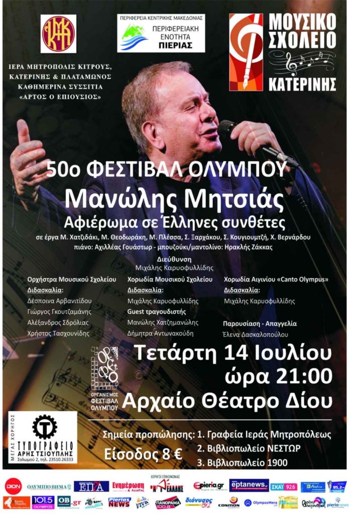 Πρόσκληση για αγορά εισιτηρίου της επερχόμενης φιλανθρωπικής συναυλίας του Μανώλη Μητσιά και του Μουσικού Σχολείου Κατερίνης την Τετάρτη 14 Ιουλίου 2021 στις 9 το βράδυ στο Αρχαίο Θέατρο Δίου, με σκοπό την ενίσχυση των συσσιτίων της Ιεράς Μητροπόλεως Κίτρους, Κατερίνης και Πλαταμώνος, απευθύνει ο Σύλλογος Γονέων του Μουσικού Σχολείου Κατερίνης.