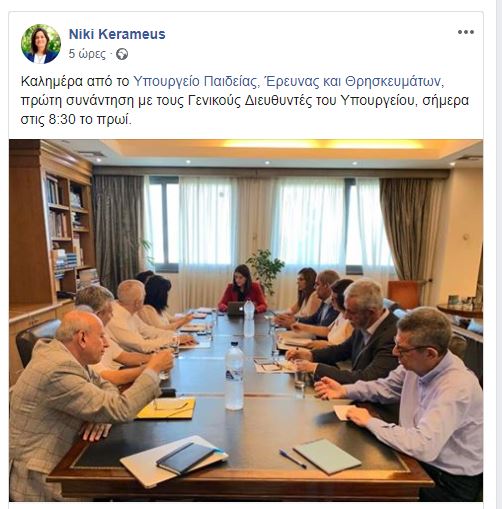 “Καλημέρα από το Υπουργείο Παιδείας, Έρευνας και Θρησκευμάτων, πρώτη συνάντηση με τους Γενικούς Διευθυντές του Υπουργείου, σήμερα στις 8:30 το πρωί” αναφέρει σε μήνυμά της στο Facebook, η νέα υπουργός Παιδείας και Θρησκευμάτων, κ. Νίκη Κεραμέως.