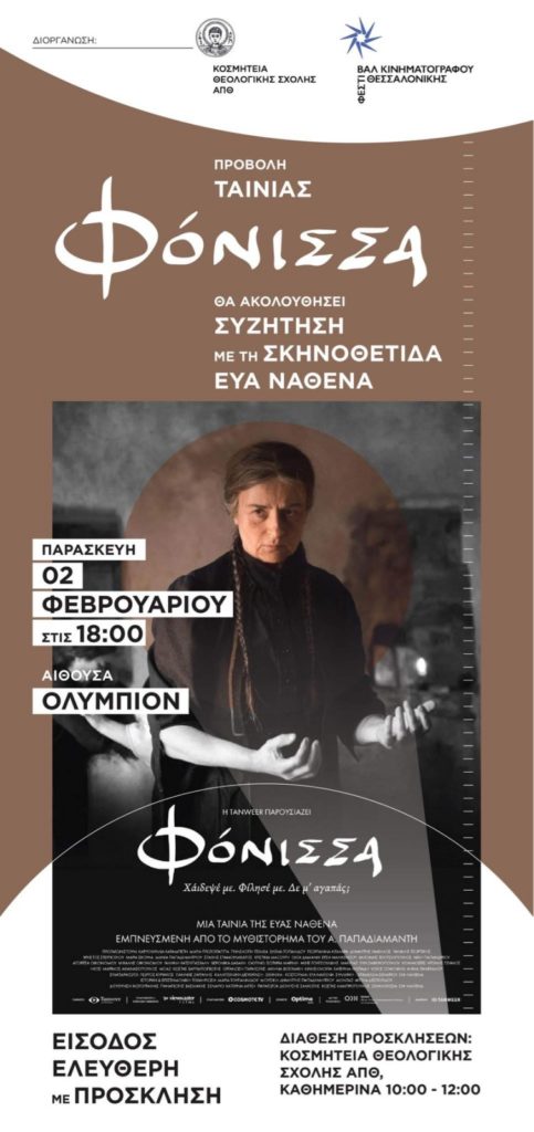 Η Κοσμητεία της Θεολογικής Σχολής του ΑΠΘ, στο πλαίσιο της προώθησης των σχέσεων Θεολογίας και Πολιτισμού, θα προβάλει την ταινία της κας Εύας Νάθενα «Φόνισσα» στον κινηματογράφο Ολύμπιον, την Παρασκευή 2 Φεβρουαρίου στις 18.00.