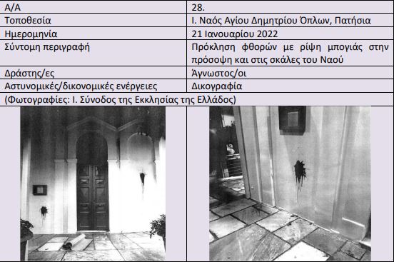 Στην Έκθεση συμπεριλαμβάνονται μόνο περιστατικά τα οποία έχουν καταγγελθεί. Από αυτά αλλά εξιχνιάστηκαν, άλλα ερευνώνται και άλλα τέθηκαν στο αρχείο. Τοποθέτηση εκρηκτικών μηχανισμών και πρόκληση φωτιάς, πάσης φύσεως βεβηλώσεις, ληστείες με απειλή ή άσκηση βίας, νεκροσυλίες, τυμβωρυχίες, βανδαλισμοί, καθώς και γενικότερες εκδηλώσεις θρησκευτικής μισαλλοδοξίας κατά της Ορθόδοξης Εκκλησίας, συνθέτουν το μωσαϊκό των εγκληματικών ενεργειών.