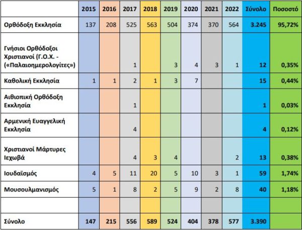 Πεντακόσια εξήντα τέσσερα (564) περιστατικά πάσης φύσεως (βανδαλισμοί, διαρρήξεις, κλοπές, ιεροσυλίες, νεκροσυλίες, ληστείες, τοποθετήσεις εκρηκτικών μηχανισμών και λοιπές βεβηλώσεις), από τα συνολικά 577 που καταγράφηκαν για το 2022, αφορούσαν την Ορθόδοξη Εκκλησία. Οκτώ (8) περιστατικά αφορούσαν τον Μουσουλμανισμό, δύο (2) τους Μάρτυρες του Ιεχωβά και από ένα περιστατικό καταγράφθηκε για τον Ιουδαϊσμό (1) και τους Γ.Ο.Χ. /Παλαιοημερολογίτες (1). Αναφέρθηκε, επίσης, 1 περιστατικό εις βάρος του Στρατιωτικού Ινδικού Κοιμητηρίου στη Θεσσαλονίκη.