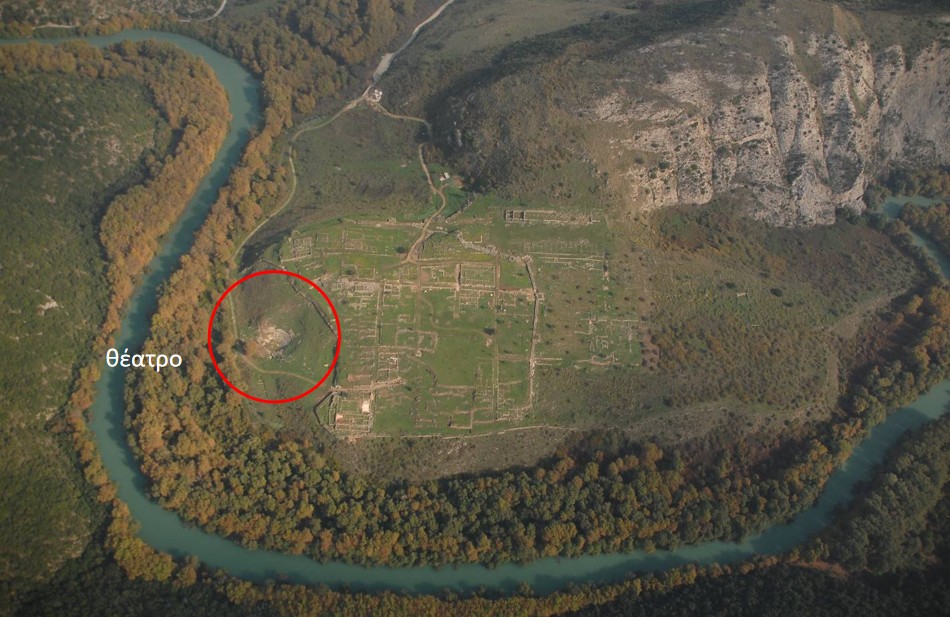 Άποψη του θεάτρου από βόρεια. Διακρίνεται το σκηνικό οικοδόμημα