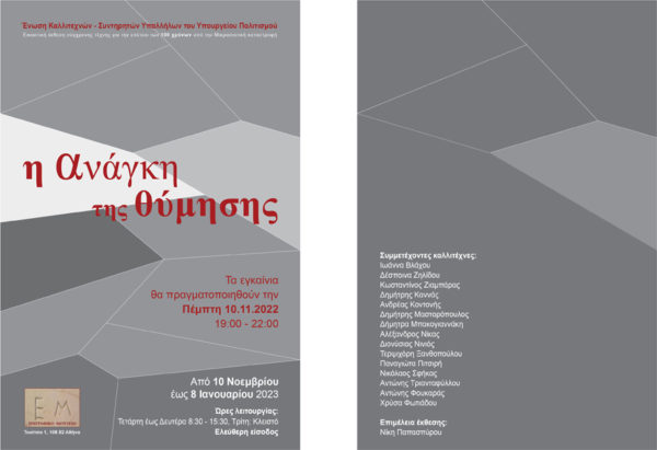 Το σωματείο «Ένωση Καλλιτεχνών-Συντηρητών Υπαλλήλων του Υπουργείου Πολιτισμού» διοργανώνει σε συνεργασία με το Επιγραφικό Μουσείο την εικαστική έκθεση «H ανάγκη της θύμησης» για την επέτειο των 100 χρόνων από τη Μικρασιατική καταστροφή. Σήμερα θα γίνουν τα εγκαίνια στις 19:00 στο Επιγραφικό Μουσείο.