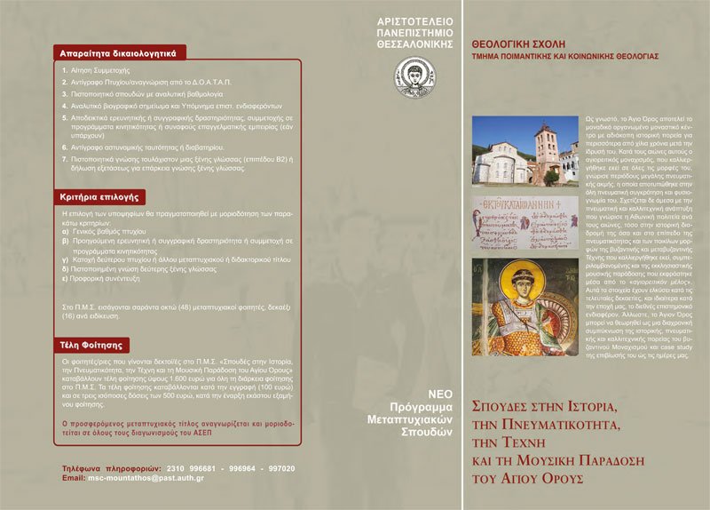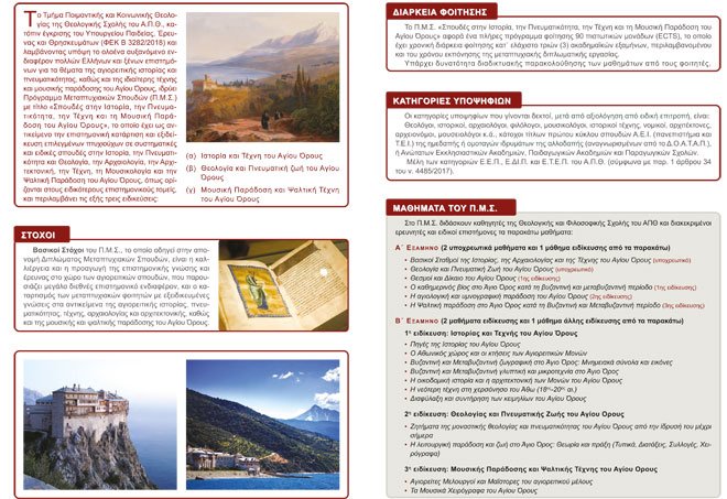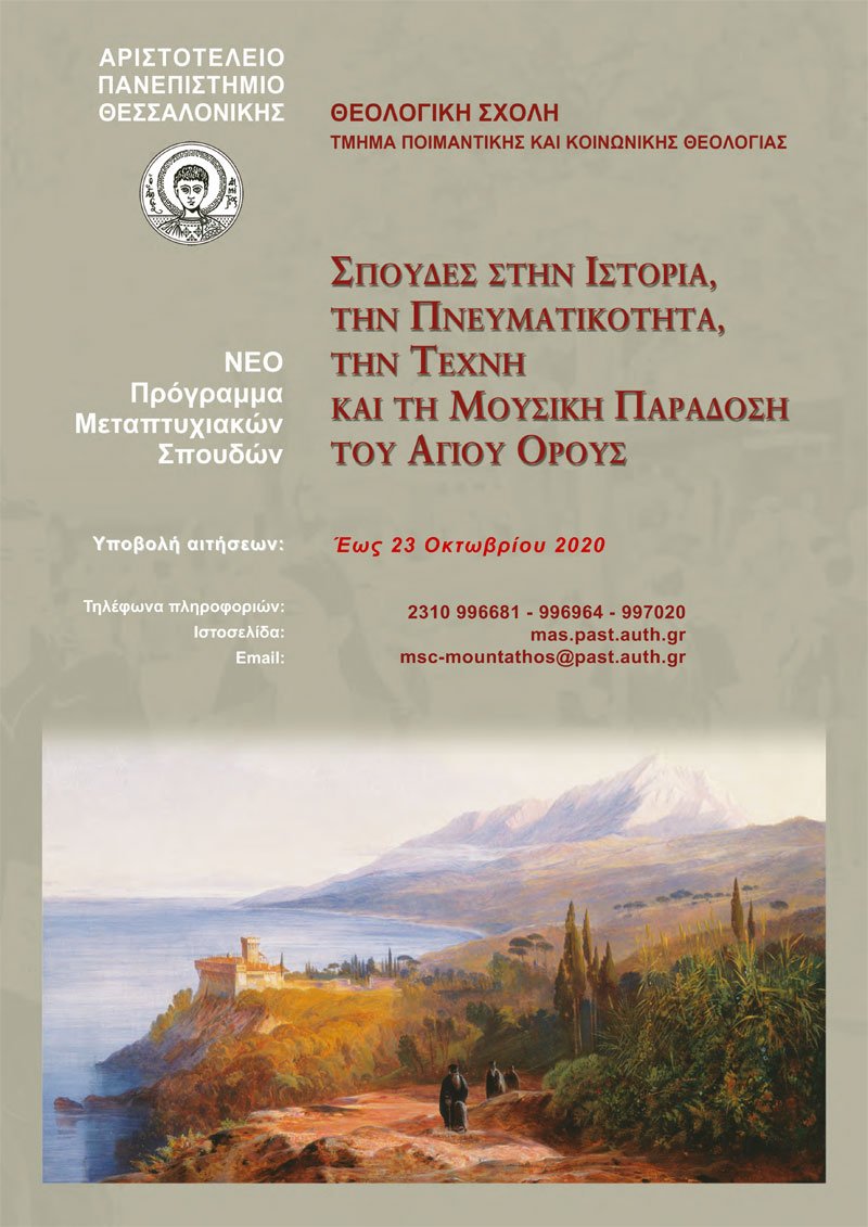 Το εξαιρετικά ενδιαφέρον Πρόγραμμα Μεταπτυχιακών Σπουδών, με τίτλο «Σπουδές στην Ιστορία, την Πνευματικότητα, την Τέχνη και τη Μουσική Παράδοση του Αγίου Όρους», του Τμήματος Ποιμαντικής και Κοινωνικής Θεολογίας της Θεολογικής Σχολής του Α.Π.Θ., λειτουργεί για τρίτη συνεχόμενη ακαδημαϊκή χρονιά, με έγκριση που έχει λάβει από το Υπουργείο Παιδείας και Θρησκευμάτων (ΦΕΚ B 3282/2018) και λαμβάνοντας υπόψη το ολοένα αυξανόμενο ενδιαφέρον πολλών Ελλήνων και ξένων επιστημόνων για τα θέματα της αγιορειτικής ιστορίας και πνευματικότητος, καθώς και της ιδιαίτερης τέχνης και μουσικής παράδοσης του Αγίου Όρους.