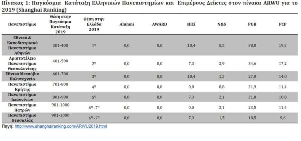 Το Εθνικό Καποδιστριακό Πανεπιστήμιο Αθηνών αναδεικνύεται για άλλη μία χρονιά ως το κορυφαίο ελληνικό πανεπιστήμιο από πλευράς ακαδημαϊκών και ερευνητικών επιδόσεων του προσωπικού του. Με βάση τα αποτελέσματα της φετινής Παγκόσμιας Ακαδημαϊκής Αξιολόγησης των Πανεπιστημίων (ARWU), γνωστή και ως «κατάταξη της Σαγκάης», επτά ελληνικά πανεπιστήμια βρίσκονται μεταξύ των 1.000 καλύτερων του κόσμου για την επιστημονική απήχηση και επίδραση των ερευνητών τους και τον αριθμό των δημοσιεύσεων σε επιστημονικά περιοδικά και βάσεις δεδομένων.