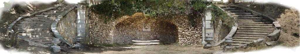 Η μαρμάρινη κλίμακα διακρίνεται από το καμπύλο της σχήμα και αποτελείται από τις βαθμίδες και τα στηθαία, για την αποκατάσταση της οποίας στη μελέτη προβλέπονται τοπικές ανακτήσεις. Η μαρμάρινη κλίμακα οδηγεί στη μαρμάρινη κρήνη -μαρμάρινη γούρνα, στην οποία έπεφτε νερό (κρήνη) από το στόμα μαρμάρινης λεοντοκεφαλής- η οποία βρίσκεται στο εσωτερικό τεχνητής κόγχης, αναφερόμενης ως σπηλιά (grotto). Η πρόσβαση στη σπηλιά επιτυγχάνεται από τις κλίμακες που βρίσκονται εκατέρωθεν αυτής. Το λιθόκτιστο τοιχίο της περίφραξης, το οποίο περιλαμβάνεται, επίσης, στη μελέτη αποκατάστασης, εκτείνεται σε συνολικό μήκος 401 μέτρων στην ανατολική πλευρά των κήπων.