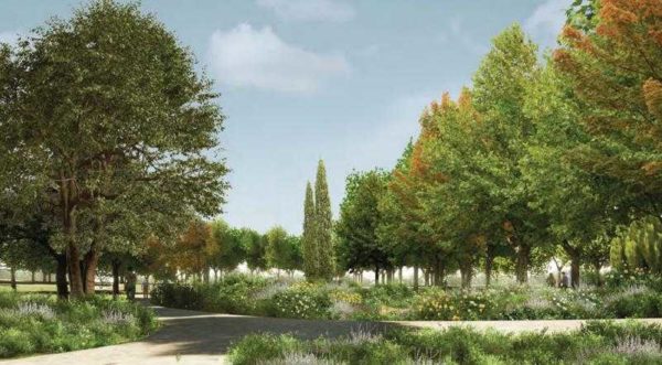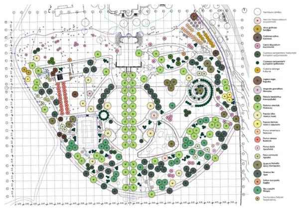 Κεντρικό στοιχείο της μελέτης αποτελεί η αποκατάσταση του βασικού άξονα των κήπων και της κεντρικής αλέας από πλατάνια (Platanus orientalis) εκατέρωθεν. Τα δένδρα περιτοιχίζονται από μεσαίους θάμνους (μυρτιές) ή/και ψηλούς (σχίνα), τονίζοντας την καθαρότητα του άξονα και αποκαλύπτοντας σταδιακά τους επιμέρους χώρους.
