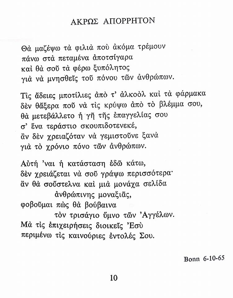 Θα μπορούσε κανείς να πει χίλια κι άλλα χίλια λόγια για τον μεγάλο νεοέλληνα ποιητή. Και είναι μεγάλος γιατί έχει τη δική του ταυτότητα. Μπορεί κάποιοι στίχοι του να θυμίζουν καμιά φορά Καβάφη ή Βρεττάκο, αλλά ο Αρχιεπίσκοπος είναι ο εαυτός του. Έχει τη δική του ποίηση, τη δική του ποιητική ταυτότητα, όπως διαμορφώθηκε από τη μακροχρόνια ποιητική του δημιουργία. Αυτήν την ποιητική του ταυτότητα υπηρετεί με συνέπεια και συνέχεια. Έτσι ο ιερωμένος ποιητής δεν περιορίζεται μόνο να ιερουργεί από το Άγιο Βήμα, Άξιος και Πανάξιος λειτουργός του Κυρίου, αλλά το ίδιο άξια και πανάξια ιερουργεί την Τέχνη από την ωραία πύλη της ποιήσεως, γιατί όπως θα ομολογήσει ο ίδιος το ποίημα είναι οδύνη, το ποίημα είναι πάθημα.