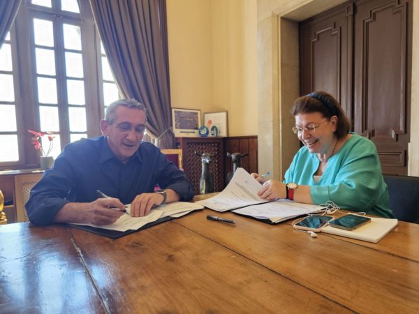 Η υπογραφή της Προγραμματικής Σύμβασης από την Υπουργό Πολιτισμού Λίνα Μενδώνη και τον Περιφερειάρχη Γιώργο Χατζημάρκο, έγινε στο γραφείο του Περιφερειάρχη, επί τη ευκαιρία της έλευσης στη Ρόδο της Υπουργού Πολιτισμού, για την απόδοση στο κοινό του Κήπου του Παλατιού του Μεγάλου Μαγίστρου, στη Μεσαιωνική Πόλη της Ρόδου.