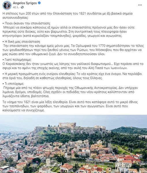 Τα βασικά σημεία της αυτοσυνειδησίας της Επανάστασης του 1821 κωδικοποιεί σε άρθρο του ο υφυπουργός Παιδείας και Θρησκευμάτων, Άγγελος Συρίγος.