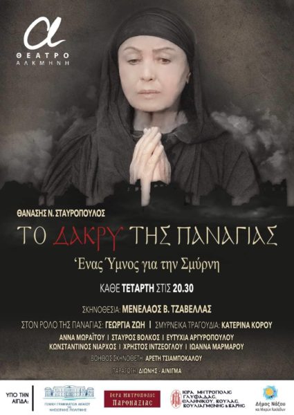 «Το δάκρυ της Παναγιάς, ένας ύμνος για τη Σμύρνη», από 30 Νοεμβρίου κάθε Τετάρτη 8.30 στο Θέατρο Αλκμήνη, του βραβευμένου συγγραφέα θεατρικών έργων αλλά και βιβλίων Θανάση Ν. Σταυρόπουλου, σε σκηνοθεσία του βραβευμένου σκηνοθέτη από την UNESCO Μενέλαου Τζαβέλλα.